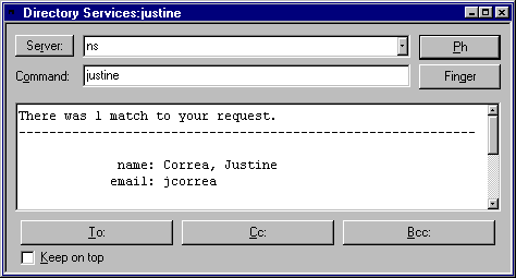 To add an address to an existing message, make sure the message you want to address is active, open the Directory Services window, do the Ph or Finger command, and use the Tab key to select the right address. Then click on the To, Cc, or Bcc button. The address from the query result is added to the appropriate field of the current message.